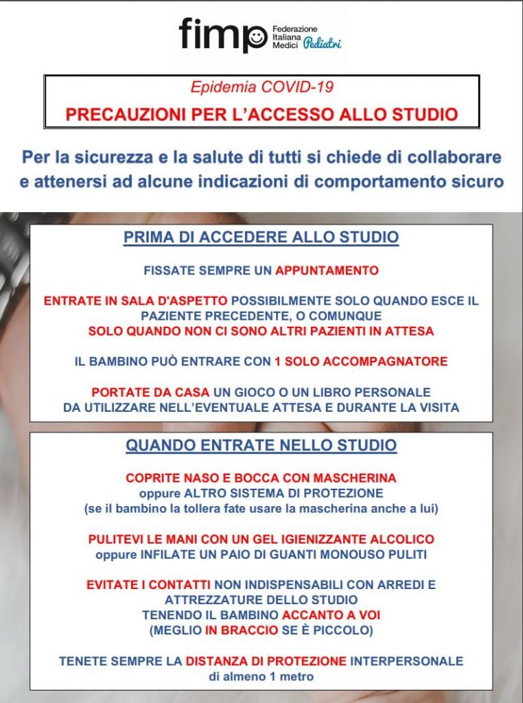 COME DA INDICAZIONI FIMP, IN CORSO DI EMERGENZA DA CORONAVIRUS, SI VISITA SOLO SU APPUNTAMENTO.